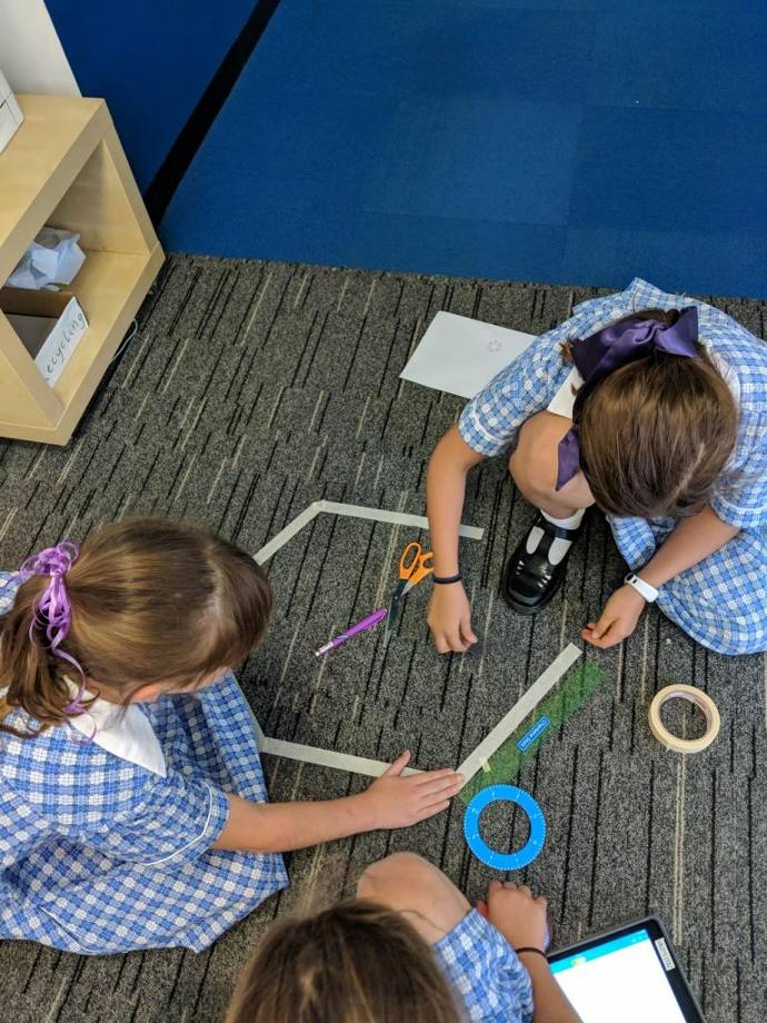 Pēc tam sadaliet bērnus pāros vai mazās grupās un lūdziet, lai tie viens otram dod vienkāršus uzdevumus. Tajos jāietver Blue-Bot sākuma punkta un galamērķa iestatīšana. Piemēram, izmantojot formu paklājiņu, “Sāciet Blue-Bot uz dzeltenā apļa un nokļūstiet sarkanajā trīsstūrī”. Bērnam, kuram ir dots izaicinājums, no sākuma ir jāmēģina nokļūt galamērķī aplikācijas spēle, virzoties pa solim. Viņiem nav atļauts pieskarties īstajam Blue-Bot, kad viņi ir iestatījuši tā sākuma pozīciju. Kad ir izdevies nogādāt Blue-Bot pareizajā galamērķī, bērnam ir jānospiež “Go”, lai palaistu visu programmu/algoritmu un pārbaudītu vai viss sanāca, šādā veidā redzot uzreiz vietas, kurās ir notikusi kāda kļūda.